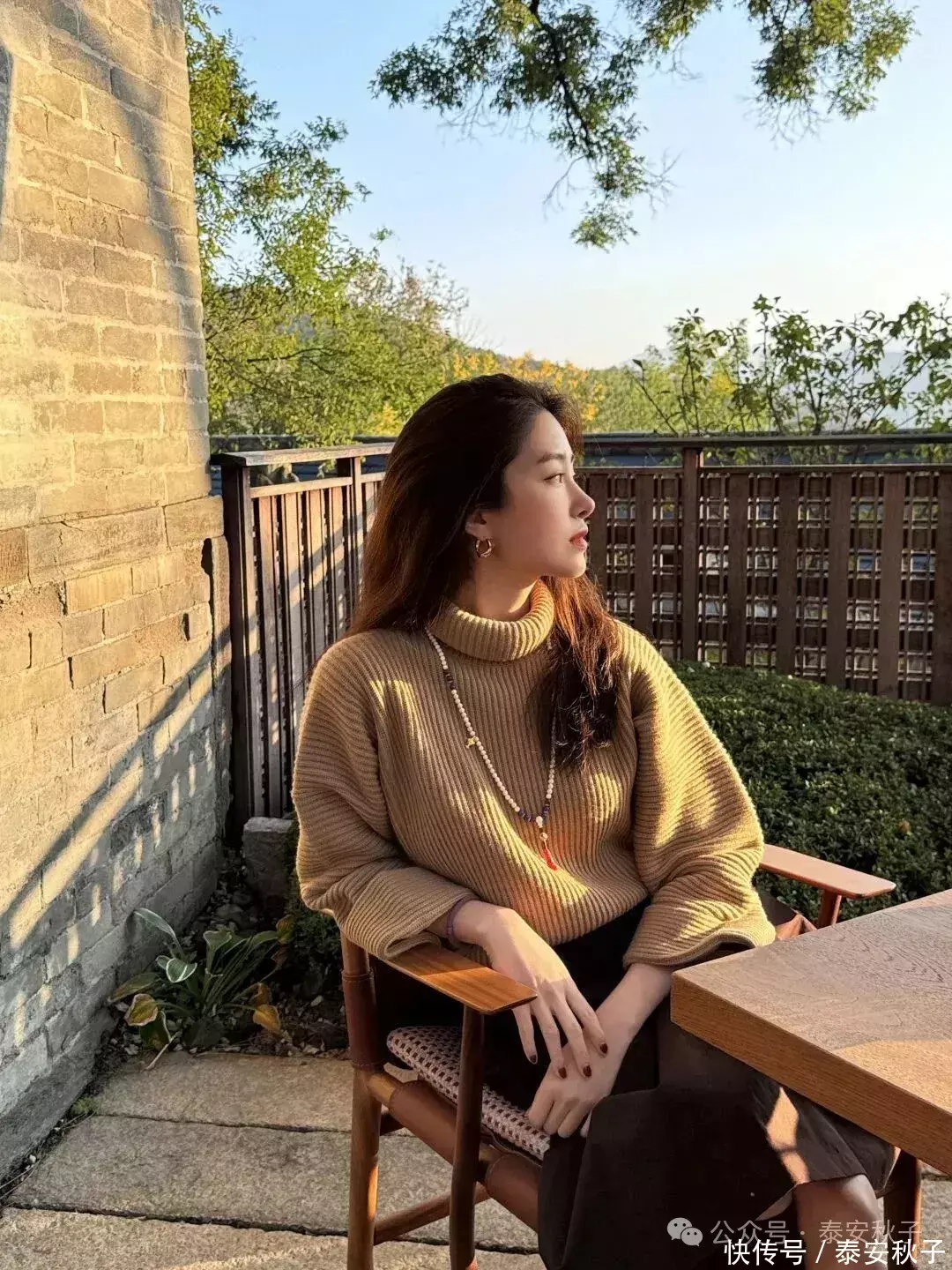 杨采钰穿了一件驼色的毛衣,卷下来的领口优雅安静,有一种温柔的气质。用一条长长的彩色珠链点缀,也不会显得太空。